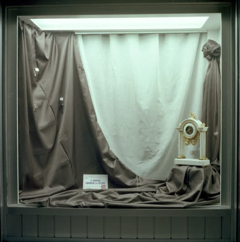 Vetrina dell'oreficeria di Pietro Ferrandico, in Piazza Popolo a Corbetta, allestita con una composizione di orologi da polso e da tavolo su un fondale di tessuti drappeggiati in occasione della terza edizione della Mostra Concorso delle vetrine organizzata dal 6 al 13 ottobre 1979.