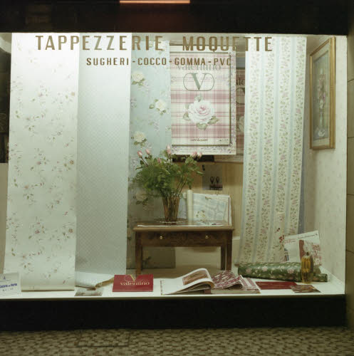 Vetrina del negozio Rondena Cislaghi, in corso Garibaldi a Corbetta, allestita con una composizione di rotoli di carta da parati, un catalogo e un tavolino con un vaso di fiori in occasione della decima edizione della Mostra Concorso delle vetrine organizzata dal 4 al 12 ottobre 1986. Sulla vetrina sono state applicate le scritte "Tappezzerie - Moquette, sugheri - cocco - gomma - pvc".