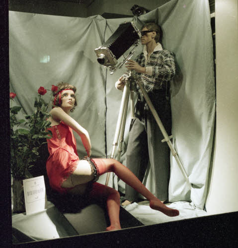 Vetrina del negozio di abbigliamento di Clementina Beltrame, in corso Garibaldi a Corbetta, allestita con una composizione di due manichini, di cui uno in posa e l'altro dietro a una macchina fotografica in occasione della dodicesima edizione della Mostra Concorso delle vetrine organizzata dall'8 al 9 ottobre 1988.
