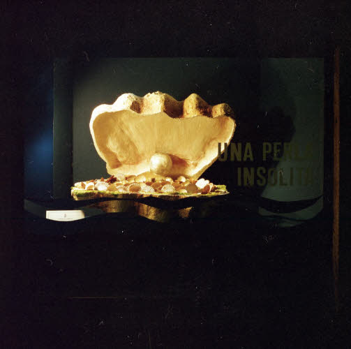 Vetrina di una gastronomia di Corbetta allestita con la ricostruzione di una grande conchiglia aperta e diverse conchiglie all'interno in occasione della quattordicesima edizione della Mostra Concorso delle vetrine organizzata dal 6 al 7 ottobre 1990. Sulla vetrina รจ stata applicata la scritta "Una perla insolita".