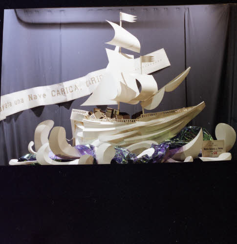 Soggetto Corbetta - Commercio - Elettrodomestici - Mostra Concorso delle vetrine 1990 Vetrina del negozio di elettronica di Remo Ranzani "STAC srl", in via Cavour a Corbetta, allestita con la sagoma di una nave, una composizione di calcolatrici e un cartello con scritto "È arrivata una nave carica carica di..." in occasione della quattordicesima edizione della Mostra Concorso delle vetrine organizzata dal 6 al 7 ottobre 1990.