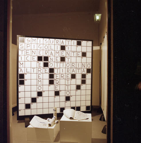 Soggetto Corbetta - Commercio - Cartolerie - Mostra Concorso delle vetrine 1991 Vetrina di una cartoleria di Corbetta allestita con una composizione di giornali della "Settimana Enigmistica" e un cruciverba di grandi dimensioni in occasione della quindicesima edizione della Mostra Concorso delle vetrine organizzata nell'ottobre del 1991.