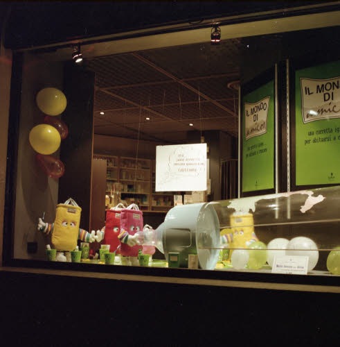 Vetrina dell'erboristeria di Gianlorenzo Mazzoleni, in corso Garibaldi a Corbetta, allestita con una composizione di prodotti erboristici, un biberon di grandi dimensioni, palloncini e due cartelli pubblicitari con scritto "Il mondo di Amicos una corretta igiene... per abituarsi a crescere" in occasione della sedicesima edizione della Mostra Concorso delle vetrine organizzata dal 3 ottobre 1992.